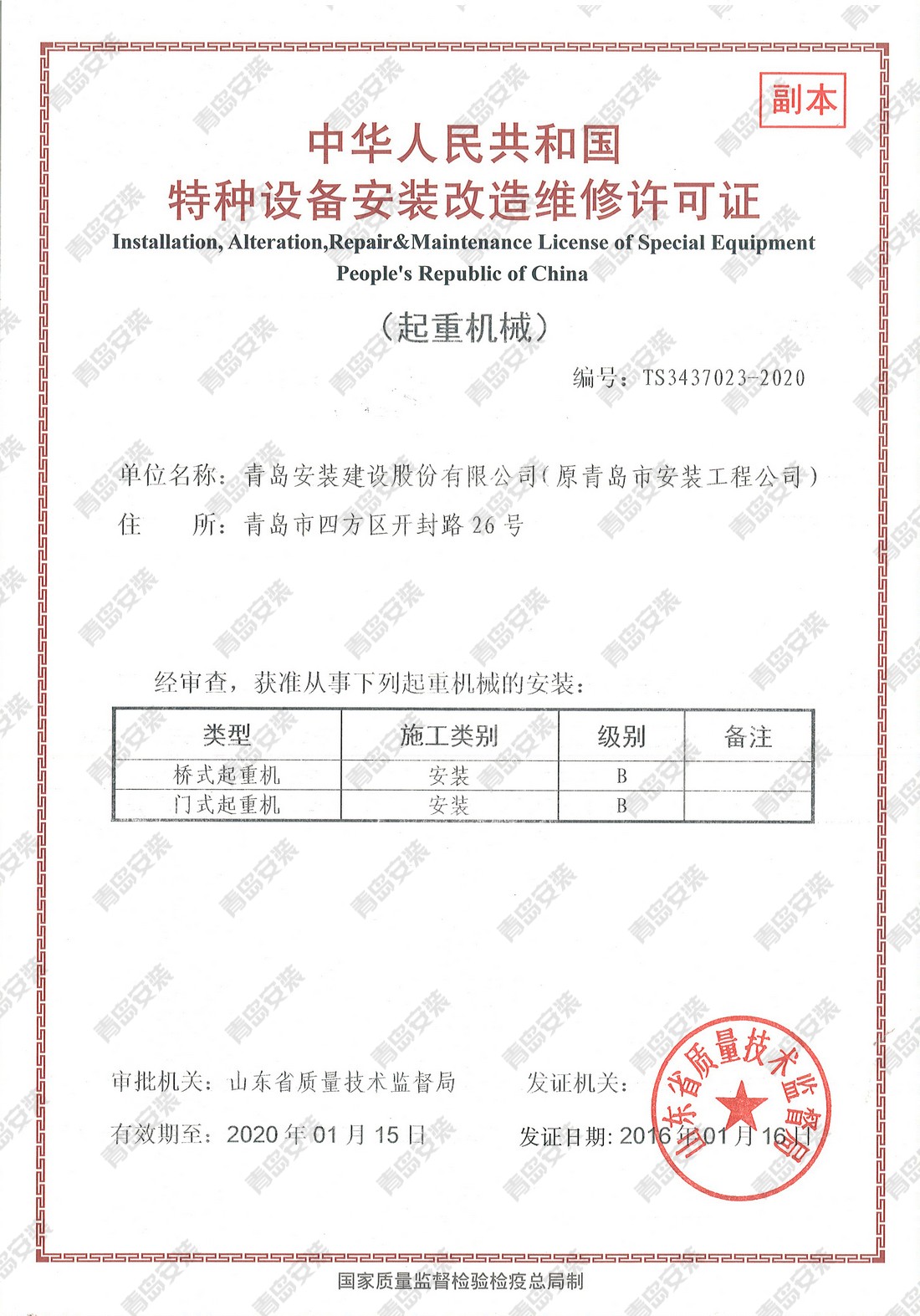特種設備安裝改造維修許可證-起重機械